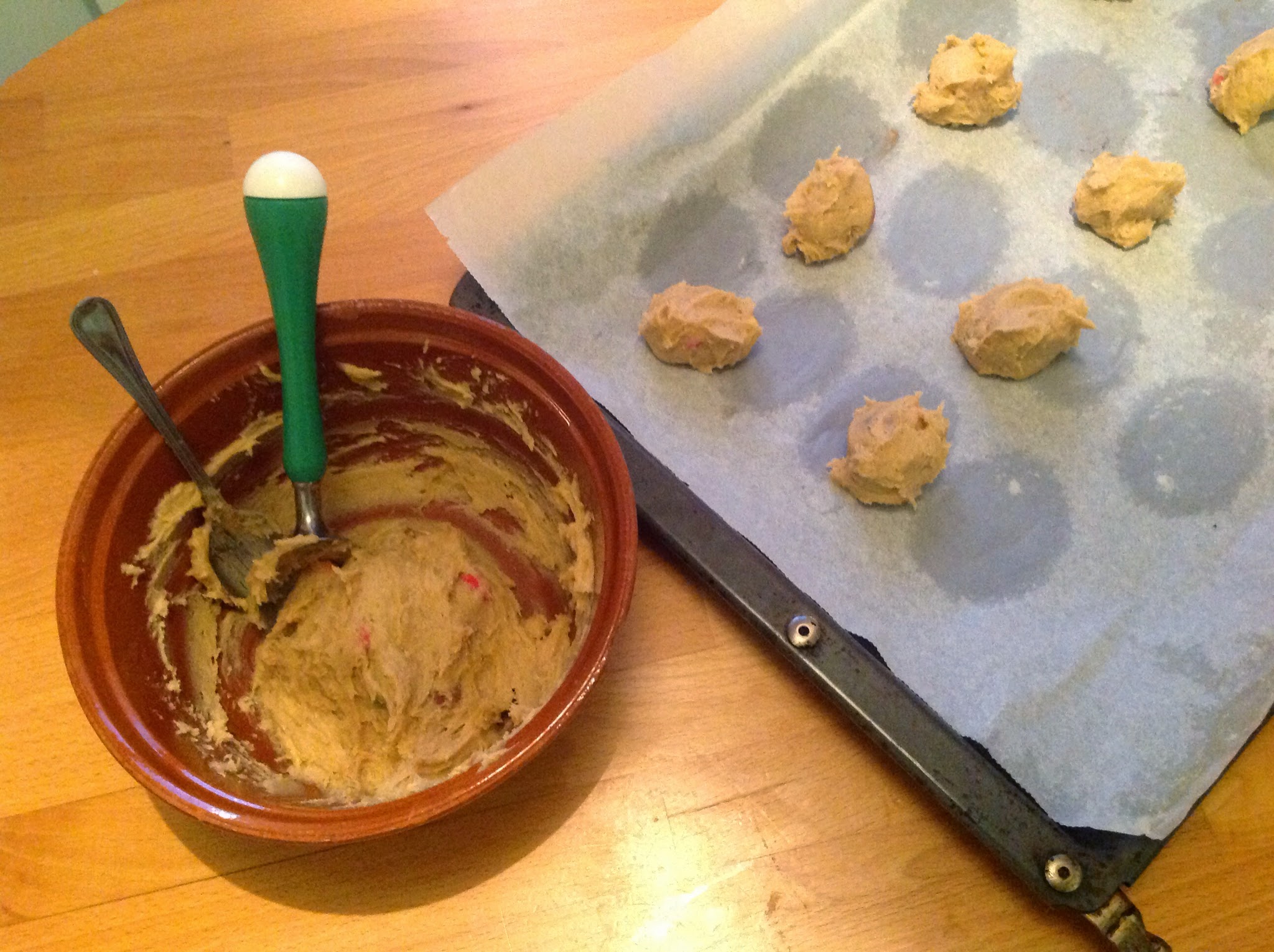 - Con una cuchara de helado se forman bolitas y se van colocando sobre la bandeja del horno (forrada con papel de horno). Hay que dejar espacio entre ellas, ya que crecen bastante.